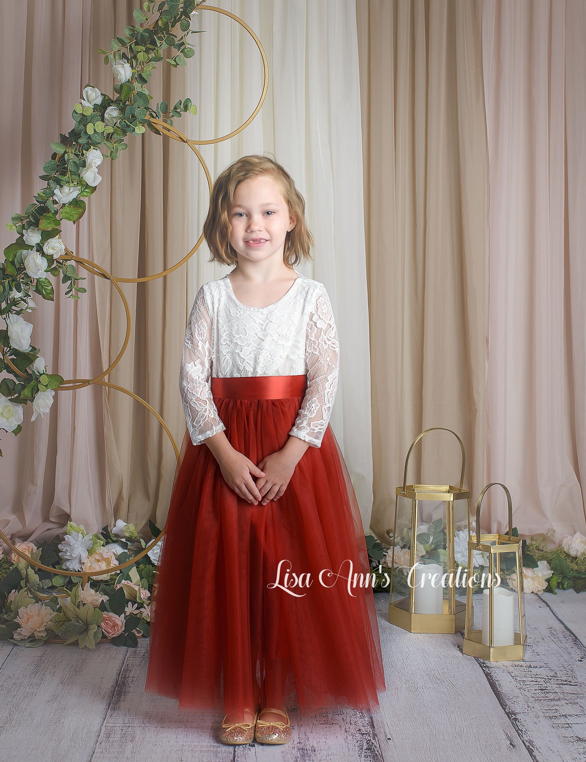 Rust Tulle Flower Girl Dress in Long Sleeves